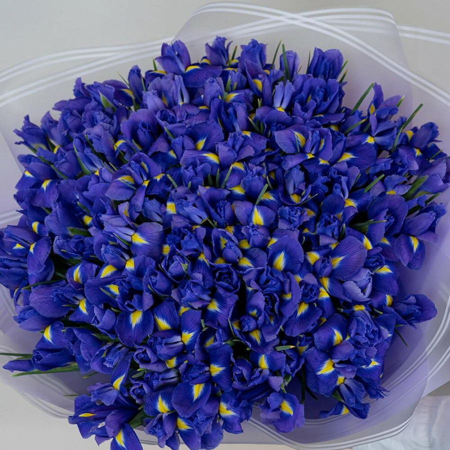 На фото букет из 101 синего ириса. В составе: ирис 101 шт, дизайнерская упаковка 1 шт, атласная лента 1 шт, . Все цветы свежие и ароматные, букет красиво оформлен и отлично подходит для подарка. Доступна доставка цветов или самовывоз.