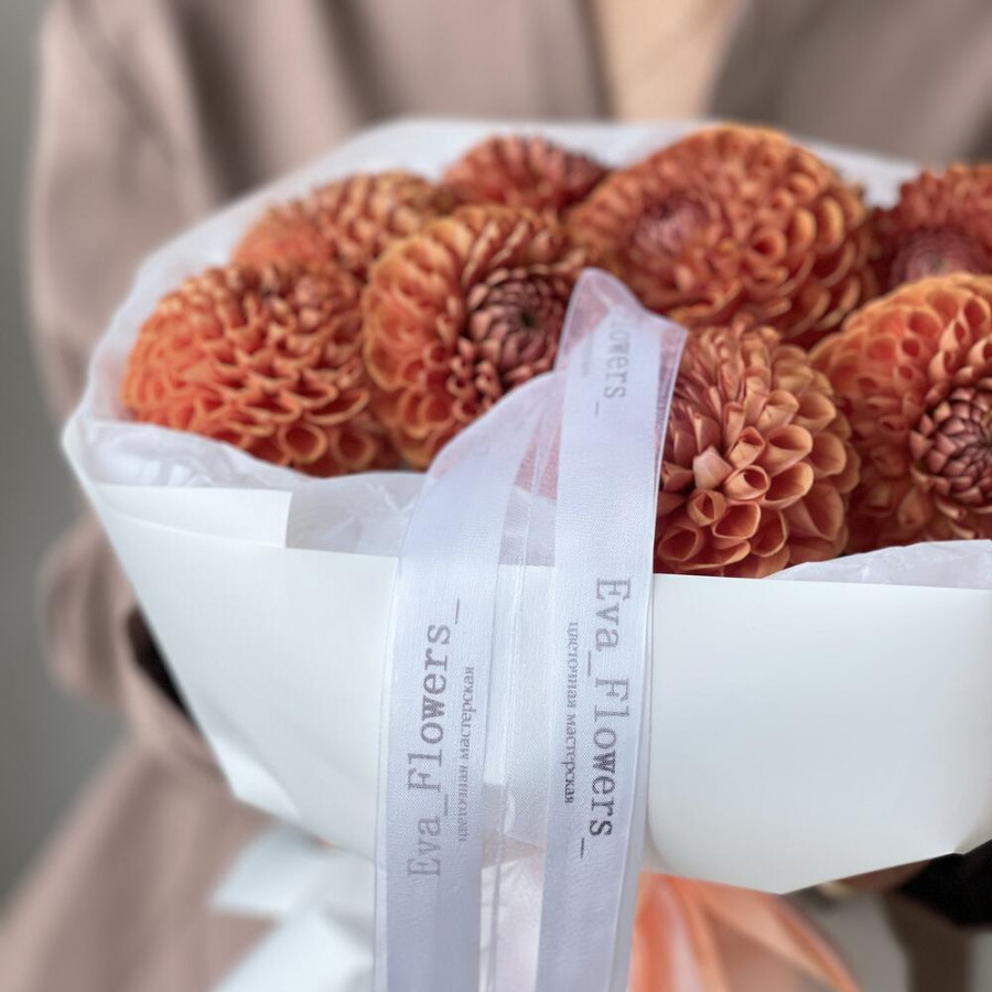 На фото букет из 11 оранжевых георгин. В составе: георгина 11 шт, дизайнерская упаковка 2 шт, атласная лента 2 шт, . Все цветы свежие и ароматные, букет красиво оформлен и отлично подходит для подарка. Доступна доставка цветов или самовывоз.