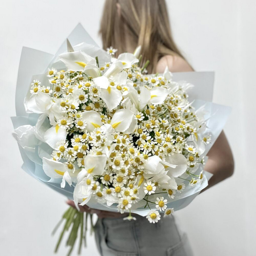 На фото букет из белых ирисов и ромашек. В составе: ирис 25 шт, танацетум 6 шт, дизайнерская упаковка 1 шт, атласная лента 1 шт, . Все цветы свежие и ароматные, букет красиво оформлен и отлично подходит для подарка. Доступна доставка цветов или самовывоз.