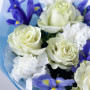 Букет из белых гвоздик, синих ирисов и белых роз в Балаково