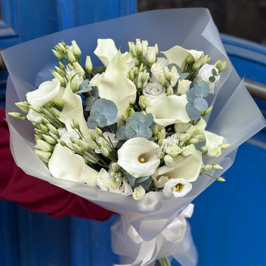 На фото букет из белых калл и эустом. В составе: эустома (лизиантус) 12 шт, калла 7 шт, дизайнерская упаковка 1 шт, атласная лента 1 шт, . Все цветы свежие и ароматные, букет красиво оформлен и отлично подходит для подарка. Доступна доставка цветов или самовывоз.