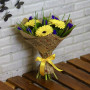 На фото букет из желтых гербер с синими ирисами. В составе: ирис 8 шт, гербера 3 шт, салал 1 шт, крафт-бумага 1 шт, атласная лента 1 шт, . Все цветы свежие и ароматные, букет красиво оформлен и отлично подходит для подарка. Доступна доставка цветов или самовывоз.