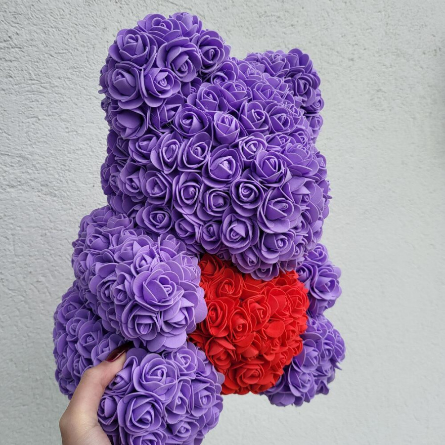 На фото фиолетовый мишка из роз. В составе: . Все цветы свежие и ароматные, букет красиво оформлен и отлично подходит для подарка. Доступна доставка цветов или самовывоз.